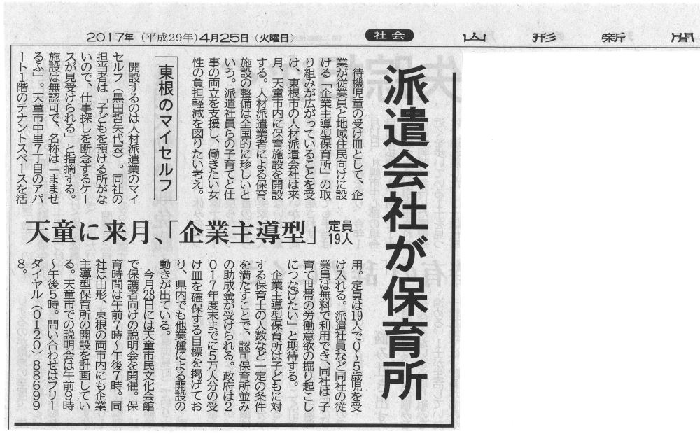 2017年5月15日に山形県天童市に開園予定のマイセルフの企業主導型保育所の『まませるふ』について記事を掲載頂きました。