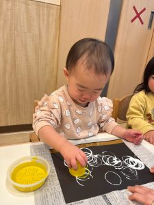 1歳児も2歳児もアレンジしたこまを作って楽しんでました。
