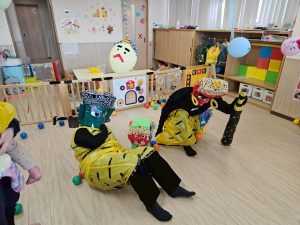 先生たちもいろいろアイデアを出しながら、室内遊びや製作を楽しんでます。
