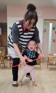 0歳児さんも歩く練習を頑張っています。室内を歩くより外の方が凸凹していたり、草木があったりで、良い運動になりますね。歩くのがどんどん上手になる子どもたちです。