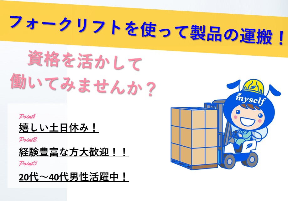 フォークリフトの免許必須ですが、人気の日勤帯でこれまでの経験を活かし働けます!